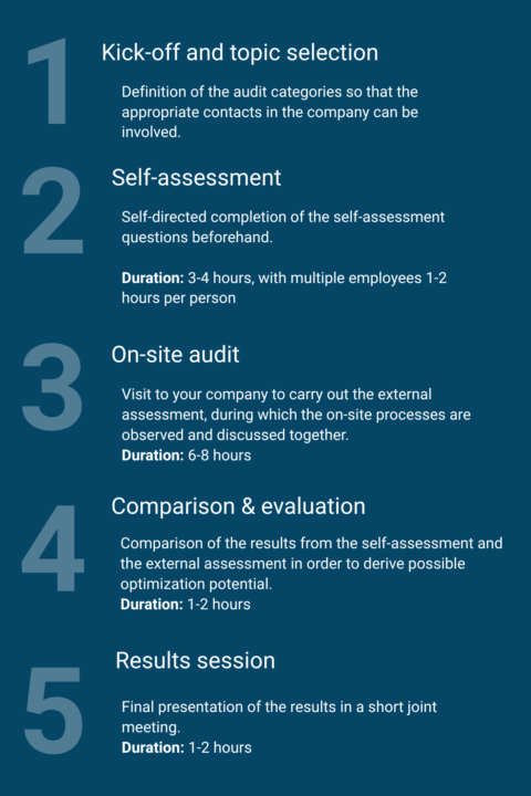 Self-assessment, external assessment and joint results session are interlinked and show where you stand today – and what potential is still untapped. Take the opportunity to gain new perspectives and take your logistics to the next level!