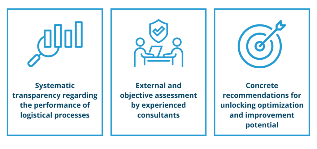 In around 15 hours, spread over two to three weeks, a well-founded picture of your logistics performanceis created – compact, practical and with clear results.